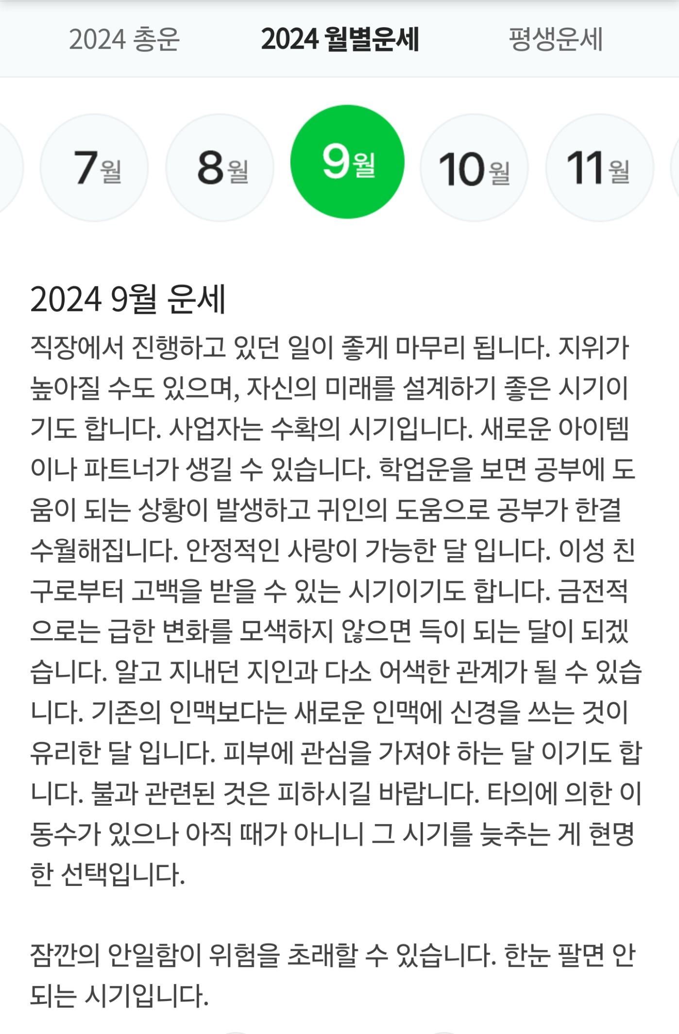 학업에 관련된 일과 애정운이 좋은 한 달이 되겠습니다. 대인운이 썩 좋지 않으므로 가능한 사람 만나는 일을 자제하 고 학업이나 자기계발에 관련된 일에 매진함이 옳겠습니다.