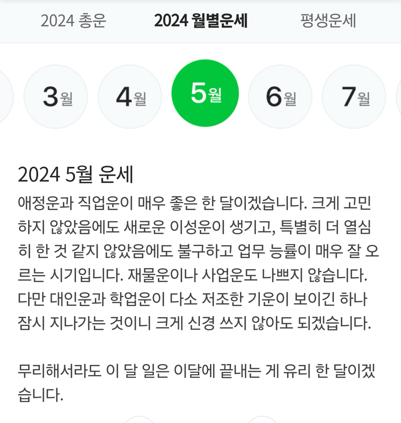 애정운과 직업운이 매우 좋은 한 달이겠습니다. 크게 고민 하지 않았음에도 새로운 이성운이 생기고, 특별히 더 열심 히 한 것 같지 않았음에도 불구하고 업무 능률이 매우 잘 오 르는 시기입니다. 재물운이나 사업운도 나쁘지 않습니다.