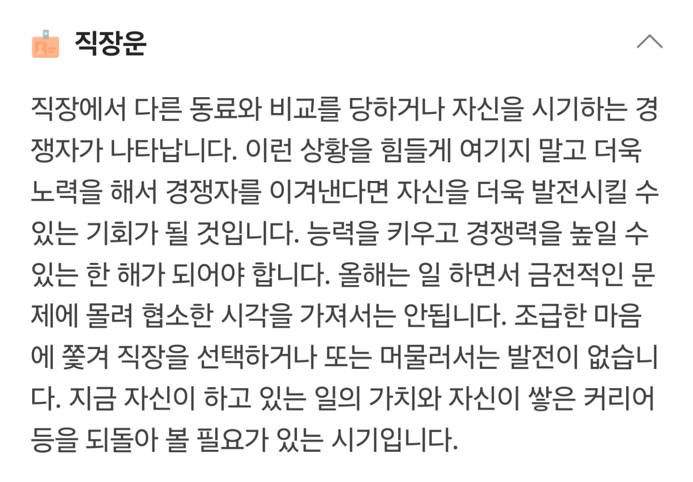조급한 마음에 쫓겨 직장을 선택하거나 또는 머물러서는 발전이 없습니 다. 지금 자신이 하고 있는 일의 가치와 자신이 쌓은 커리어 등을 되돌아 볼 필요가 있는 시기입니다.