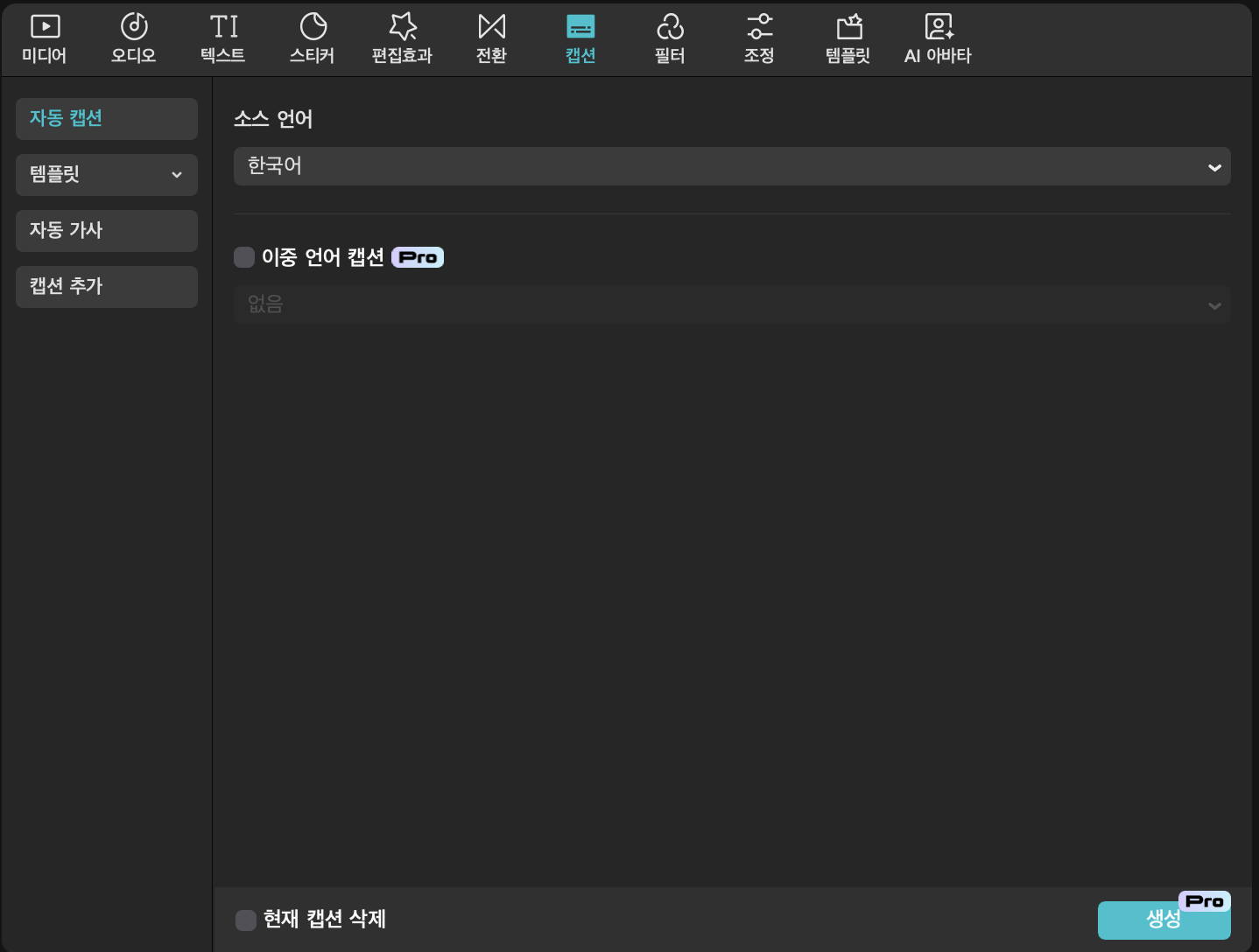 자막이 생성된 후에는 오탈자나 잘못 인식된 부분이 있는지 확인하고 수정하는 과정이 필요하다. 이를 위해 자동 생성된 캡션 바를 클릭하면 '캡션' 탭에서 텍스트를 쉽게 수정할 수 있다.