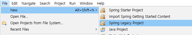 spring Legacy Project를 눌러 새 프로젝트를 생성합니다.