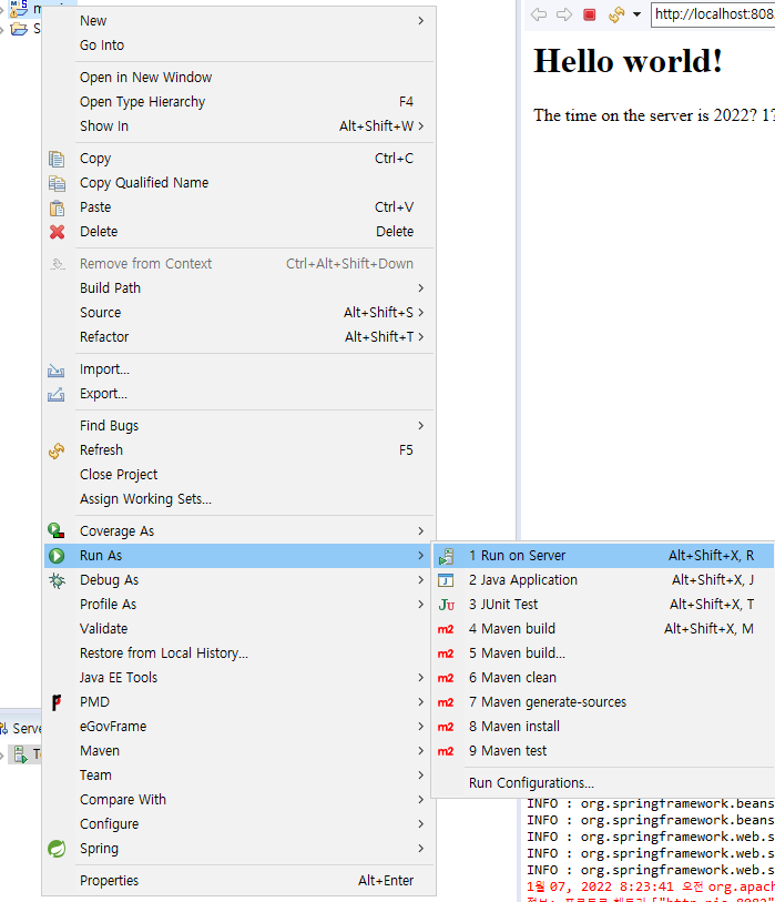 프로젝트 선택하고 우클릭을 합니다. Run As에 Run on Server를 선택합니다
