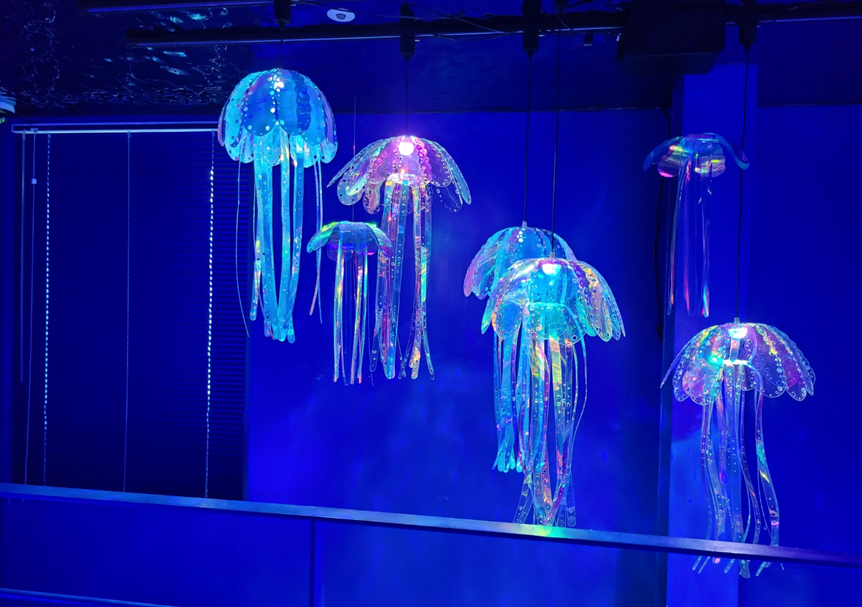 H: 연남동 카페 오버딥. 해파리 컨셉이었는데 엄청 쨍한 파랑색으로 뒤덮여서 바닷속에 있는 느낌이 들었다.
