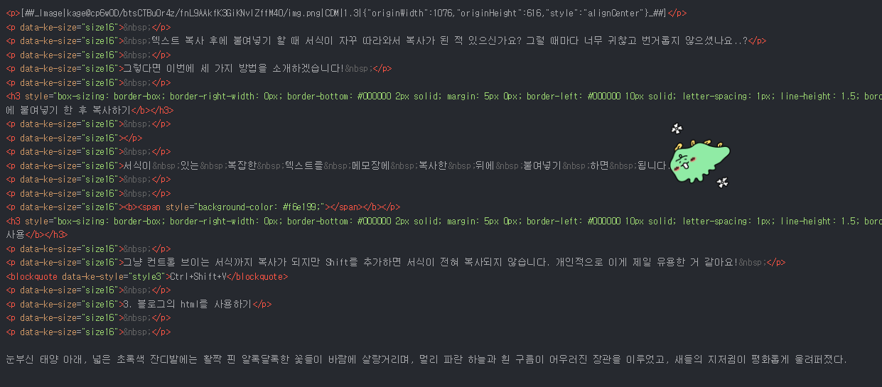html에 단순 텍스트를 붙여넣기 하면 서식이 지정되지 않습니다. 이렇게 한 뒤에 서식을 별도로 지정해주는 방법도 있습니다. 아래 이미지 중간에 제가 죠르디 달아놓은 부분 보이시나요?
